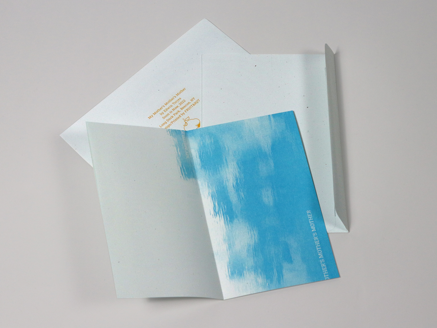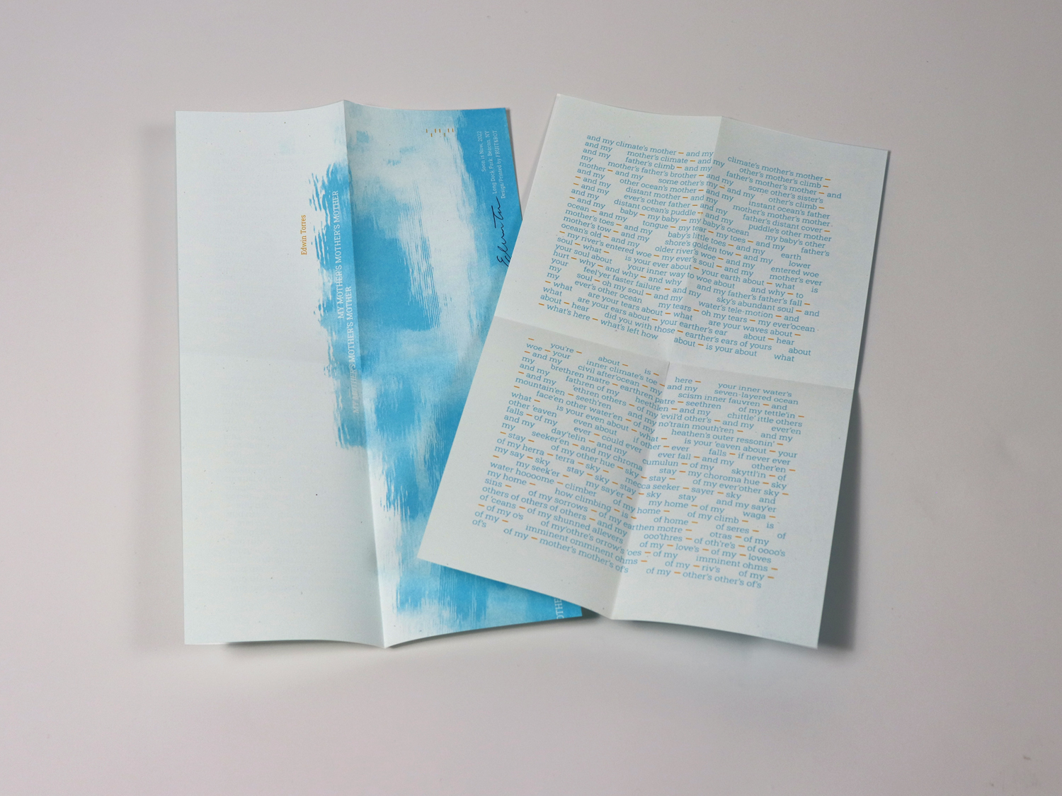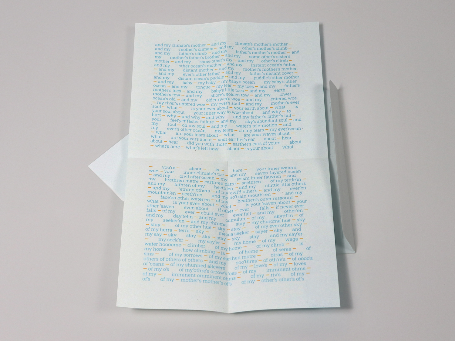 Small edition print of Edwin Torres’ poem, My Mother’s Mother’s Mother, performed at Soon is Now in 2021. Torres is a bilingual, New York-based poet—a self-proclaimed “lingualisualist” whose work is “rooted in the languages of sight and sound.”